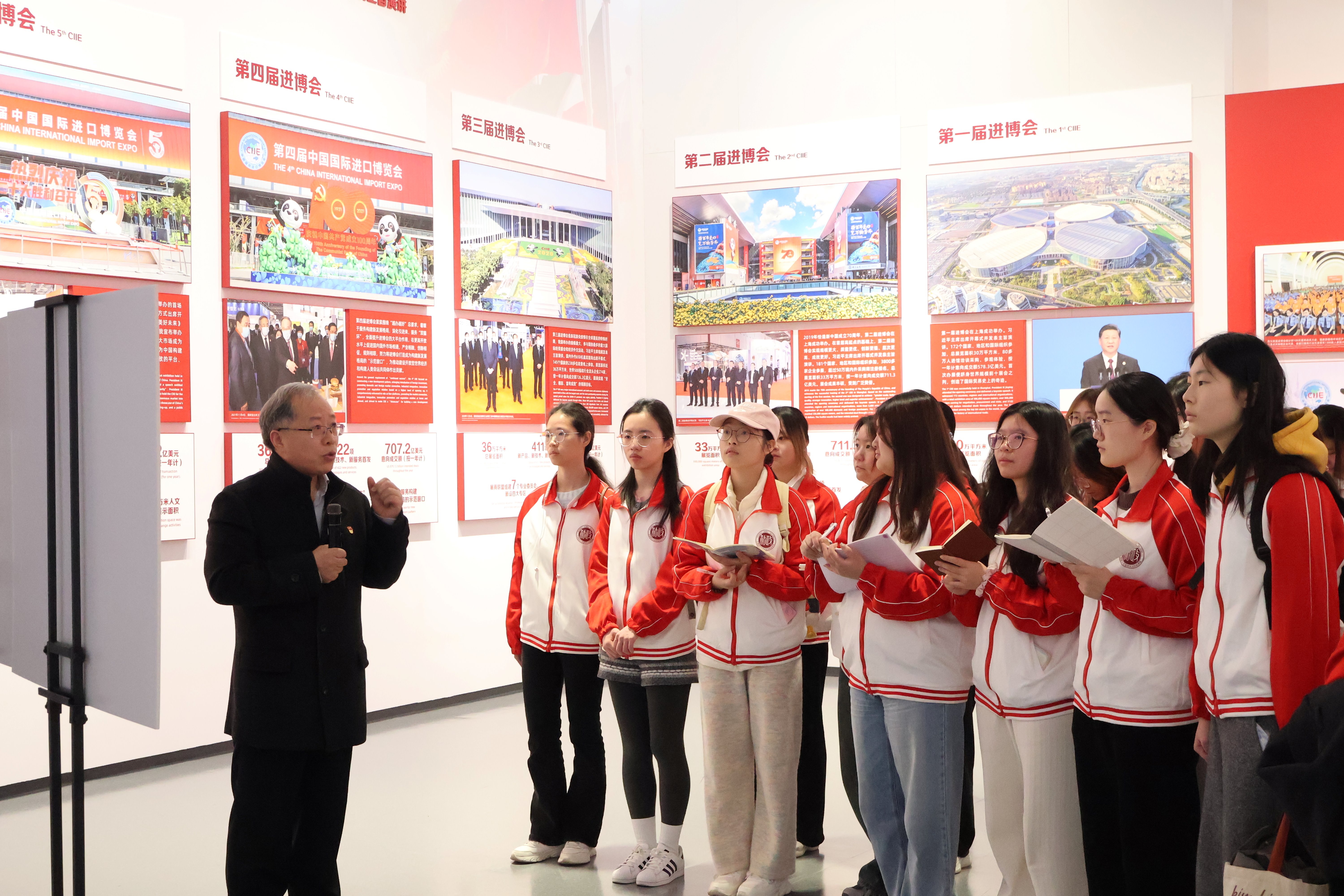 党的二十届四中全会提出,扩大高水平对外开放,开创合作共赢新局面。多年来,进博会已成为中国与世界各国共享机遇、共同发展的重要平台。活动伊始,免费色情影片porn党委副书记、副院长姚秋磊回顾了免费色情影片porn此前举办的系列情景思政课程,强调追寻总书记的足迹,既是一次思想洗礼,更是一次实践历练;他勉励同学们在情景课堂中用心观察、深入思考,从进博文化展示中心这一开放窗口,学习感悟中国与世界同频共振的时代脉搏。